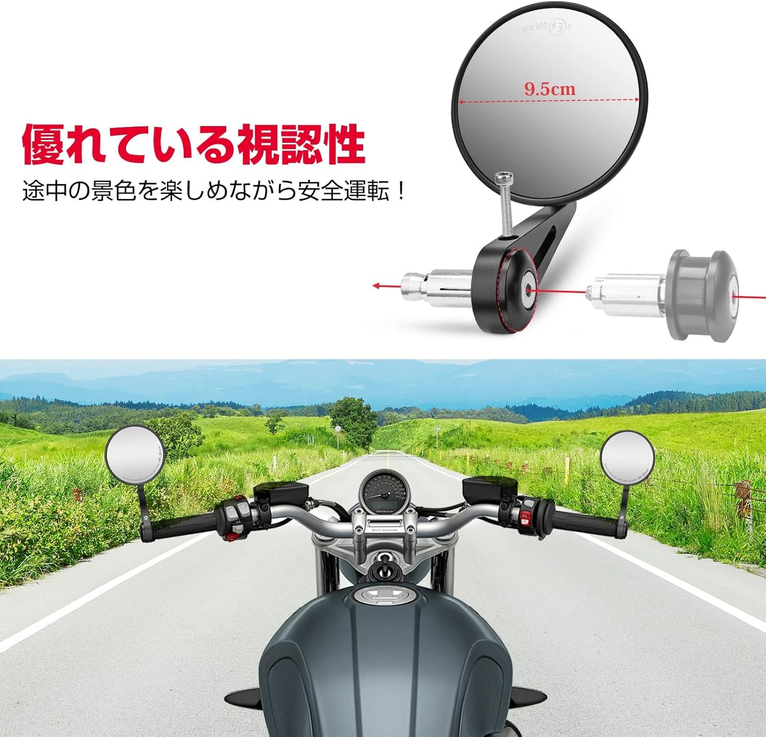 KEMIMOTO バーエンドミラー 丸型 98mm CNC 加工 6061 アルミ 凸面鏡 左右セット 汎用 13-19mm 360° 調整 車検対応 ブラック