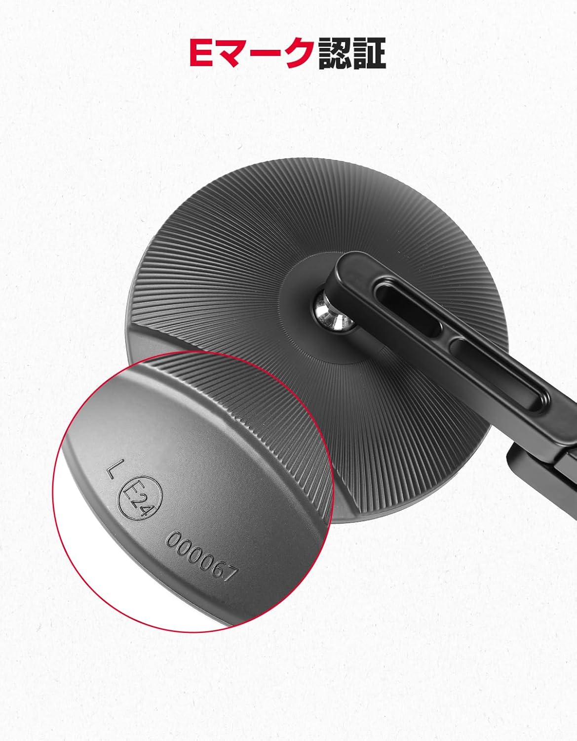 直径103mmの丸型バーエンドミラー左右セット。22mm/25.4mmハンドル外径対応の汎用モデル。車検基準適合、360°+150°角度調整可能で広い後方視野を確保。