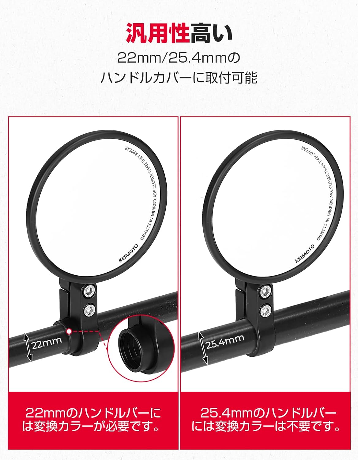 KEMIMOTO バイクバーエンドミラー 車検対応 丸型 103mm 左右セット 22mm/25.4mm ハンドル対応 汎用 360° 調整 軽量 ブラック 2504