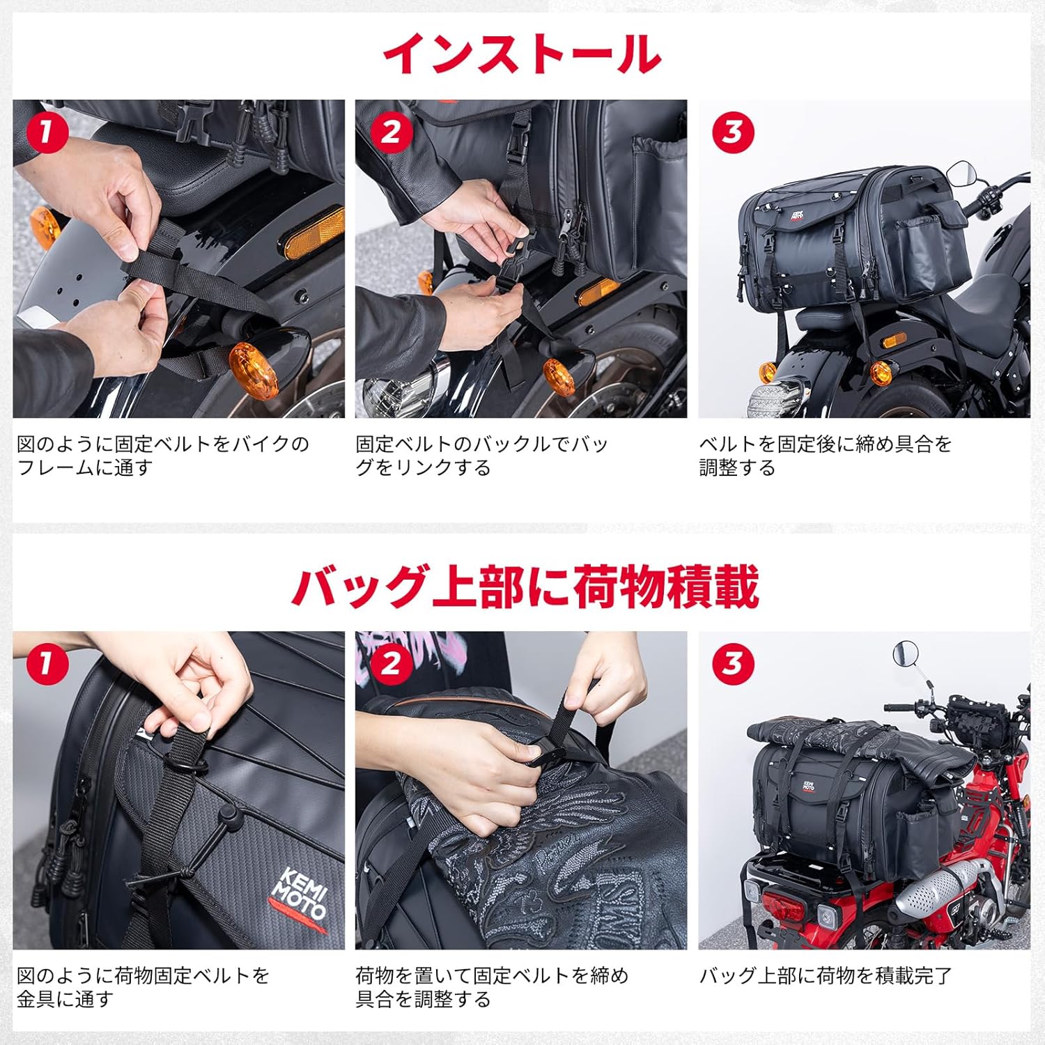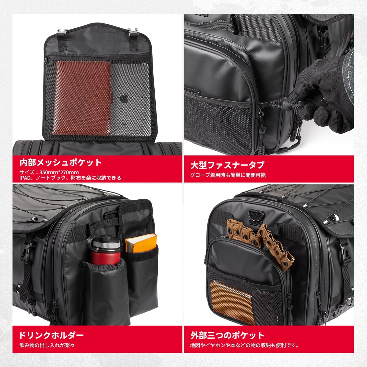 キャンプツーリングを本格的に楽しむライダーのための、大容量・高防水リアバッグです。